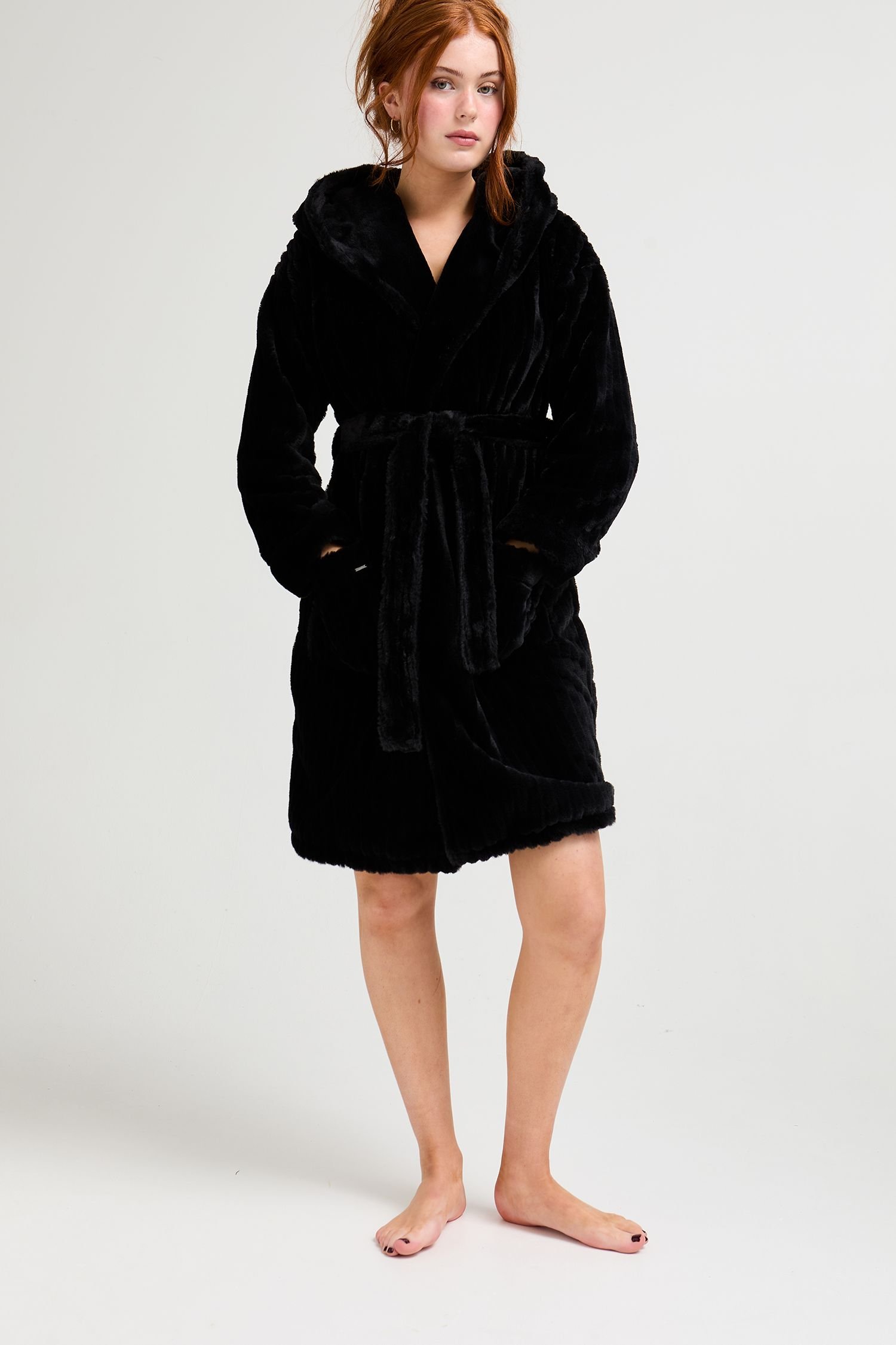 Luxurious black cloud robe with a hooded neckline and functional front pockets. Made from soft, plush fabric for ultimate comfort. Ideal for relaxing at home or post-shower wear.