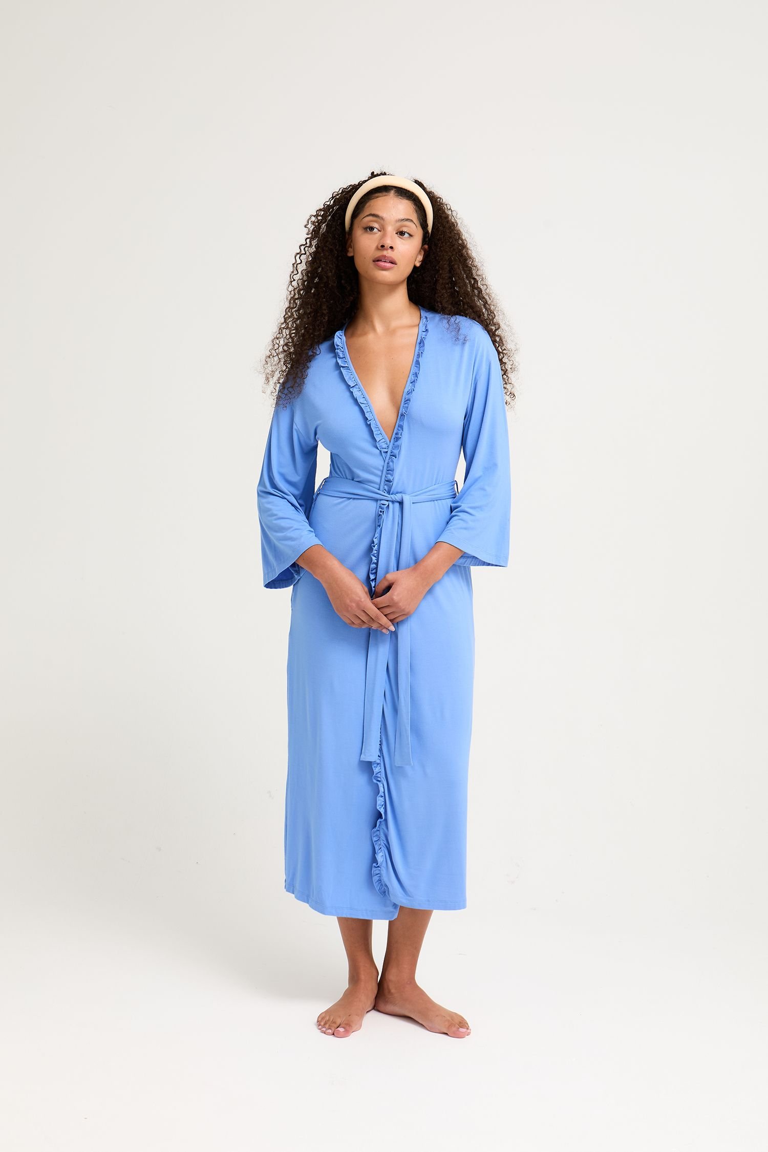 Elegant and comfortable, this Bright Blue Bamboo Frill Kimono features a blend of bamboo fabric and satin trims. Ideal for a relaxed evening or lounging at home.