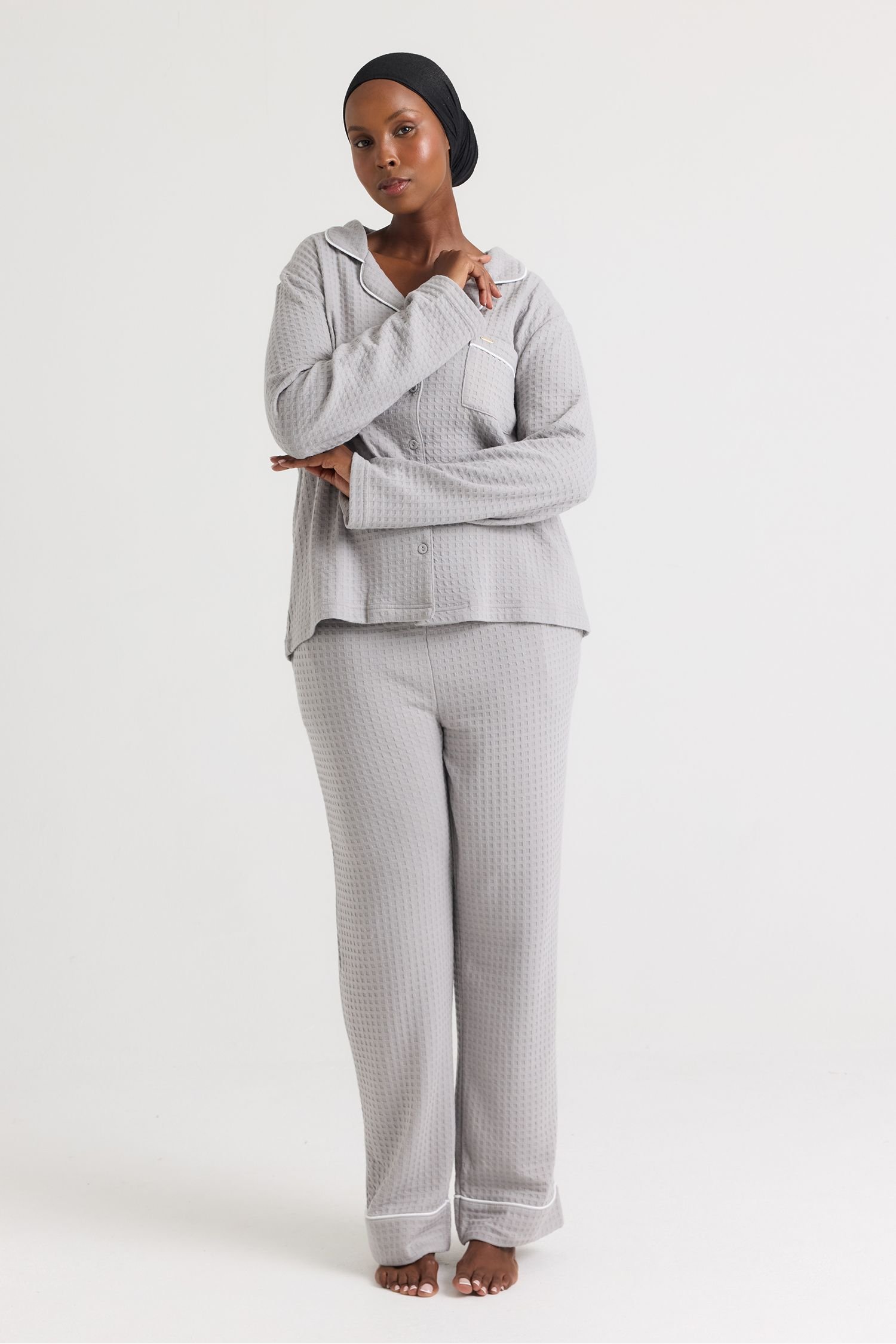 Luxurious waffle pyjama set in grey featuring a premium weight and cotton-blend feel. Ideal for ultimate relaxation, inspired by luxury hotel suites and serene spas.