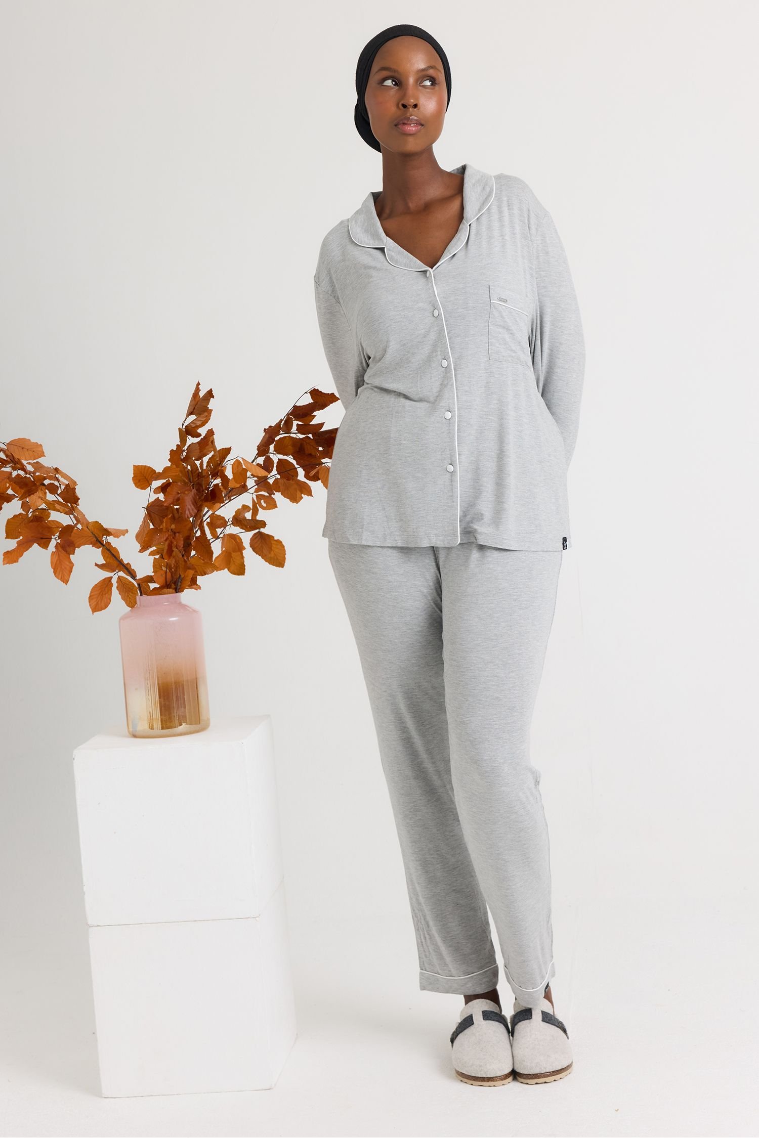 Luxurious mid grey bamboo pyjama set featuring a long-sleeve top and full-length pants. Ideal for a comfortable night's sleep or lounging at home.