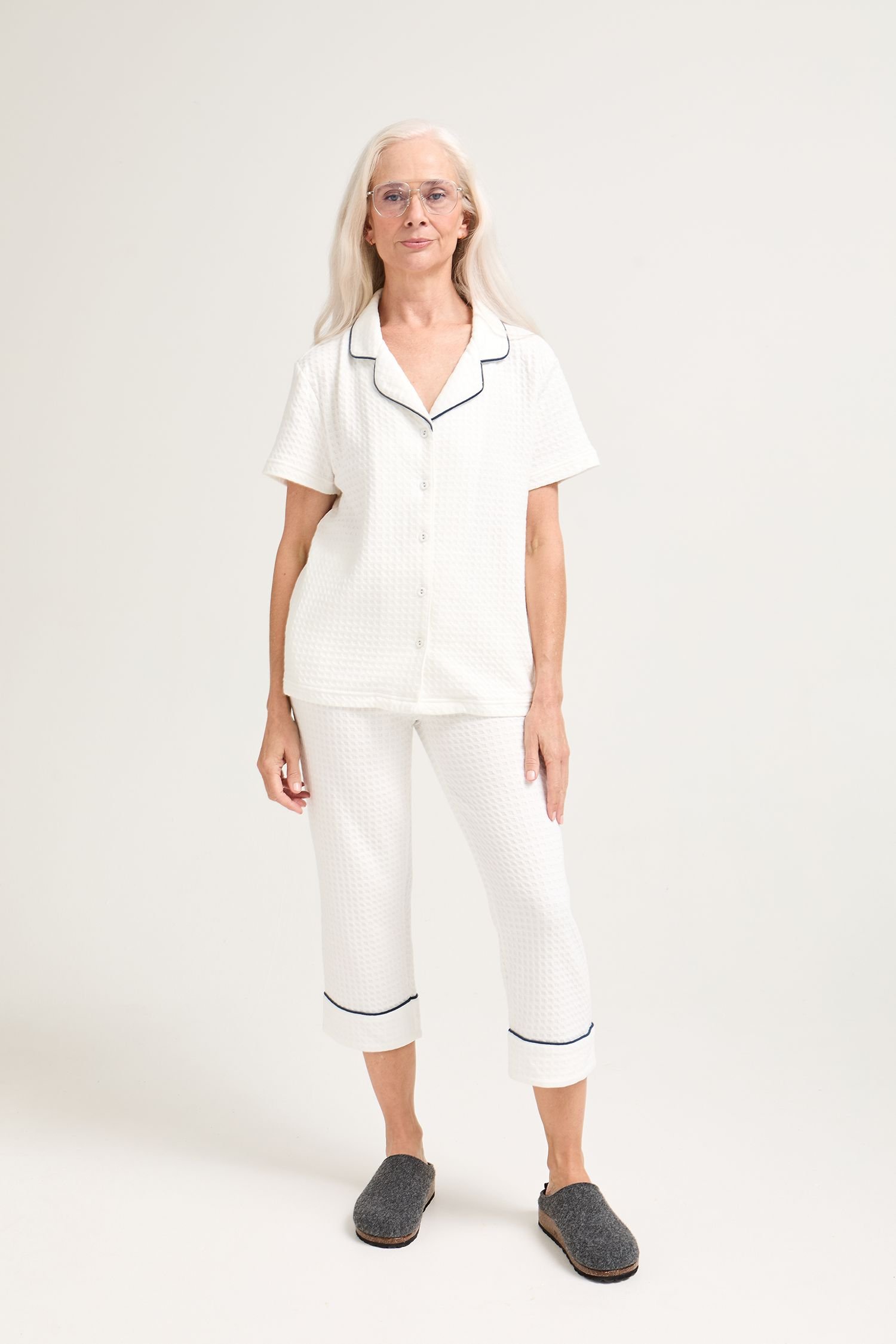 Luxurious white waffle poly-cotton loungewear set designed for ultimate comfort. Featuring a short-sleeve shirt and matching trousers, perfect for relaxing at home.