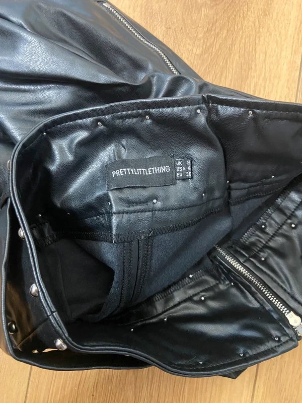 Black Leather Skirt with Silver Studs from PrettyLittleThing. This edgy skirt features a sleek black leather material with silver studs for a striking look. Perfect for adding a bold touch to your outfit.