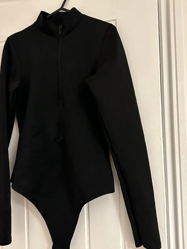 Sleek black scuba zip bodysuit with a high collar and full-length sleeves. Perfect for a modern, edgy look.