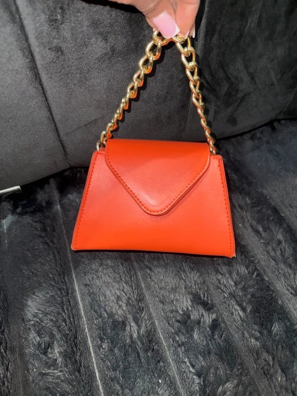 Cute burnt orange mini envelope bag with a chunky gold chain strap. Structured shape with a pointed flap closure. Crafted from faux leather, this bag is ideal for a night out or festival season. Barely used, excellent condition.