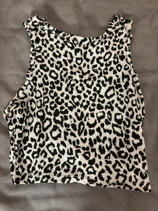 The PrettyLittleThing Black and White Leopard Print Sleeveless T-shirt is available in sizes XS.