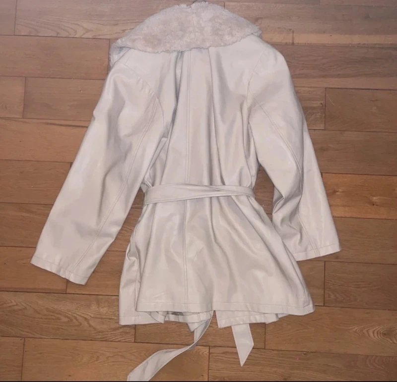 The PrettyLittleThing Cream Leather Fur Coat is available in sizes M.