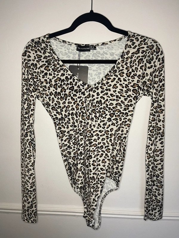 The PrettyLittleThing Leopard Print Long Sleeve Bodysuit is available in sizes XS.