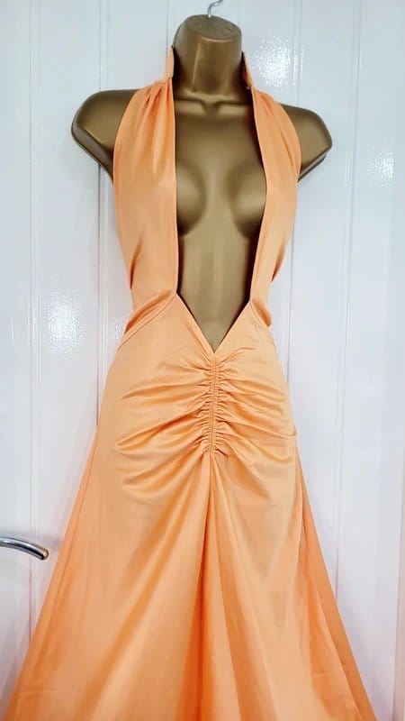 Striking orange satin midi dress with a cut-out halter neckline and ruched detailing on the bodice. Ideal for evening events or special occasions.