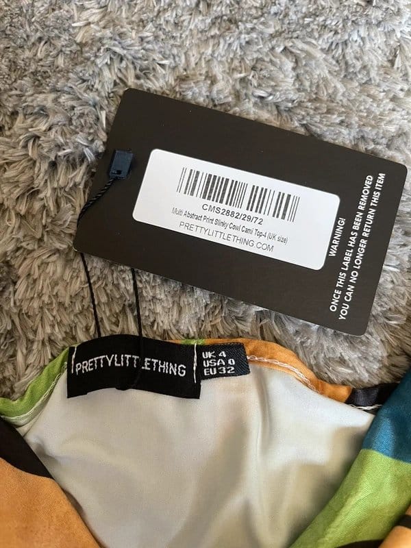 Blue Multi Cami Top from PrettyLittleThing. This versatile top features a cowl neckline and sleeveless design. Crafted from a blend of polyester and spandex, it offers a stretchy and comfortable fit. The multi-colored print adds a fun and playful touch, perfect for casual outings or layering under jackets.