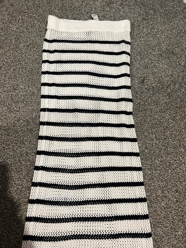 The PrettyLittleThing White and Black Stripe Crochet Maxi Skirt is available in sizes S.