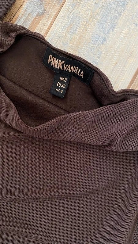 The PrettyLittleThing Brown Tulle Sleeve Mini Dress is available in sizes S.