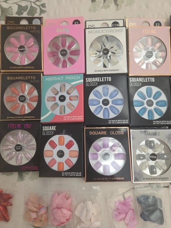 A collection of 32 sets of press-on fake nails from Primark, featuring a variety of fun designs. Each set includes 24 nails with adhesive for up to 7 days of wear.