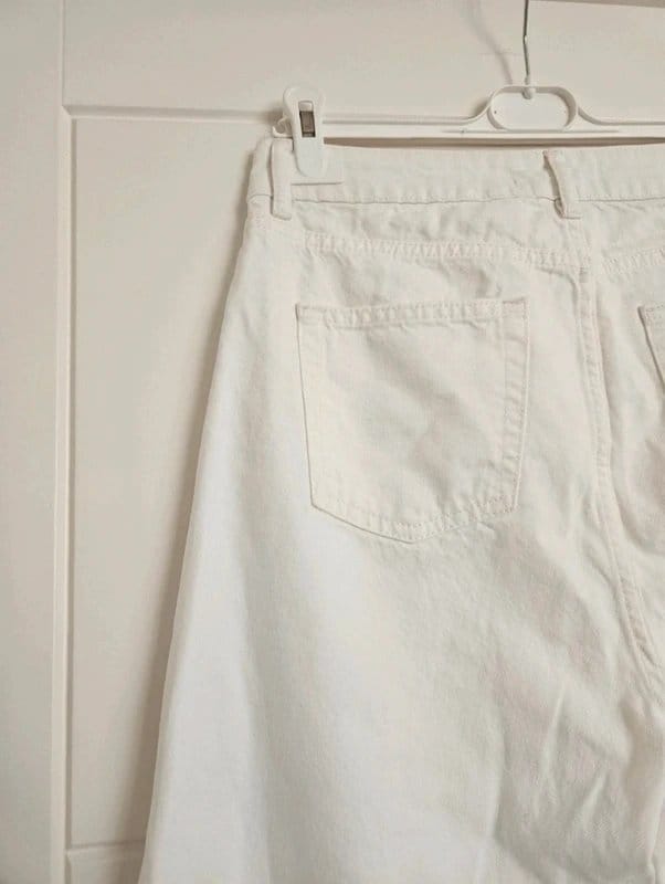 See all outfit ideasStylish white ecru cropped jeans by Primark. Made from durable denim, these jeans feature a wide-leg silhouette and a classic five-pocket design. Perfect for casual spring and summer wear.