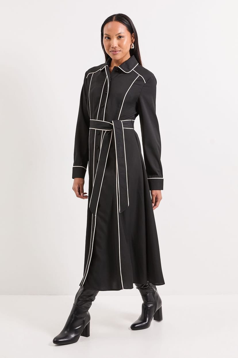This black crepe midi dress features contrast piping details for a contemporary twist. The classic collared neckline adds a sophisticated touch, while the belted waist creates a flattering silhouette. Long sleeves with contrast cuff detailing provide elegant coverage.