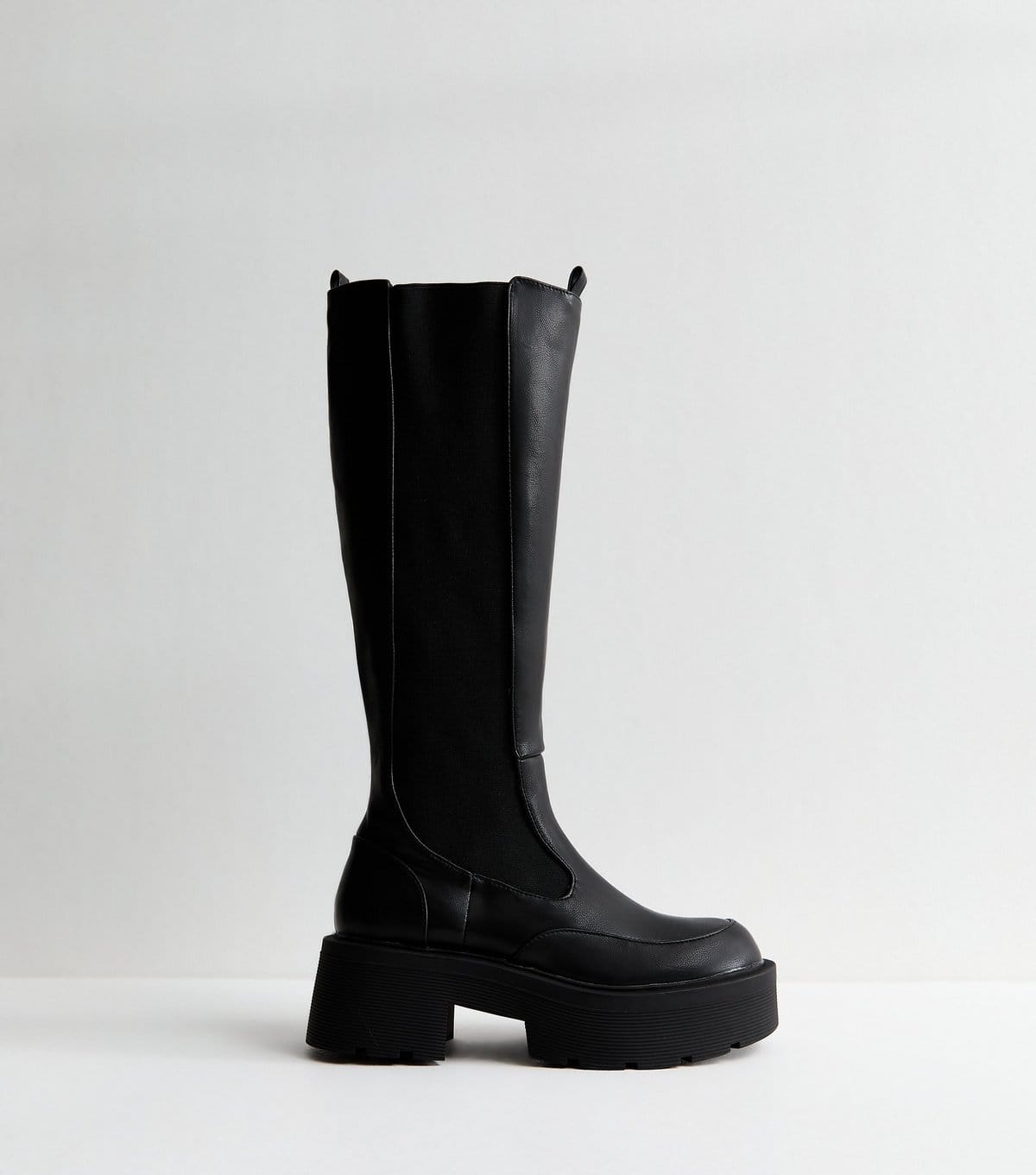 Elegant knee-high boots in black faux leather with a chunky platform sole. These zip-up boots are perfect for everyday wear with their comfortable fit and stylish design.