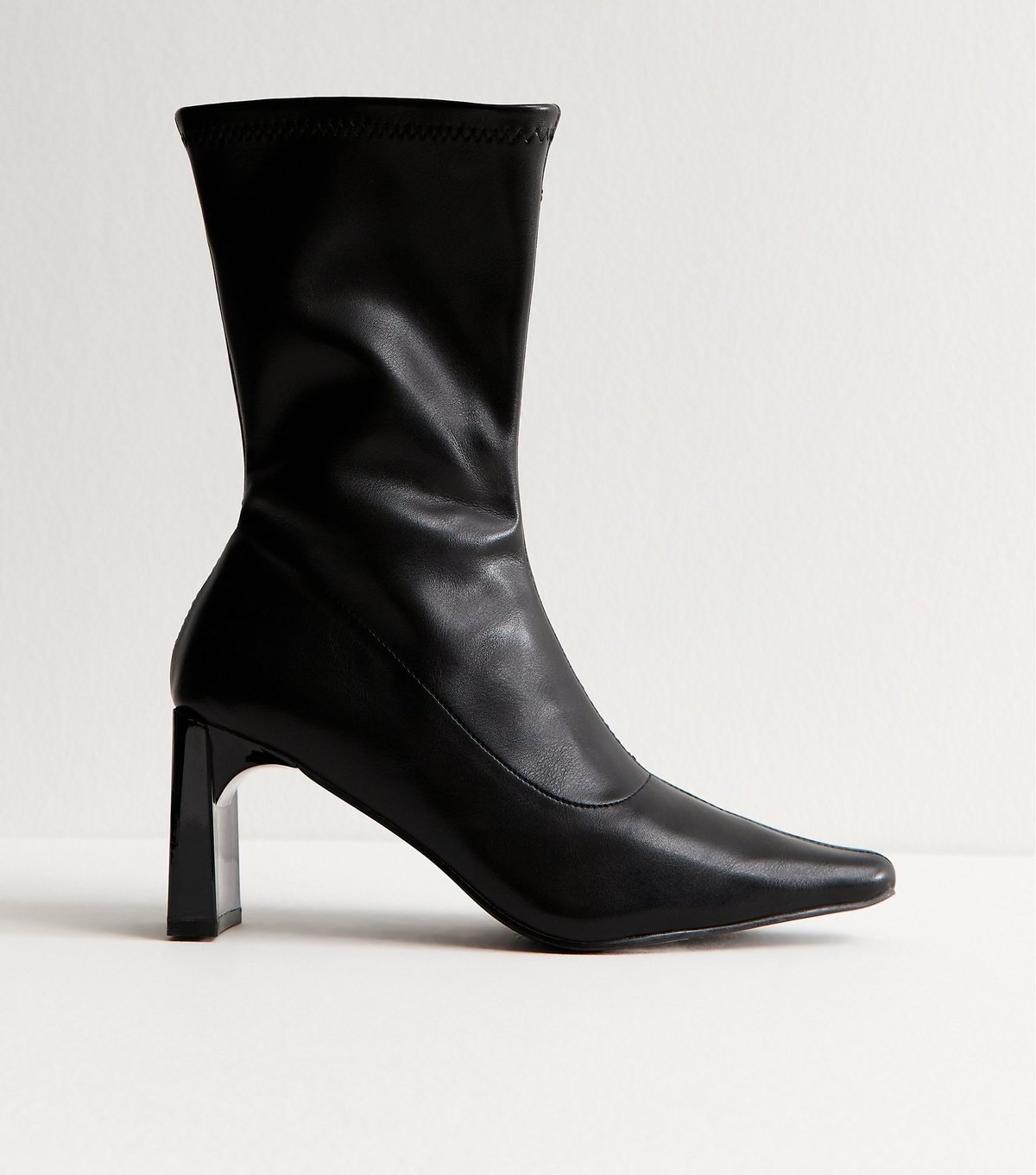 Sleek black faux leather pointed toe boots from Public Desire. Perfect for autumn wear, these boots pair well with skirts or trousers. Featuring a regular fit and a high block heel, they add a touch of sophistication to any outfit.