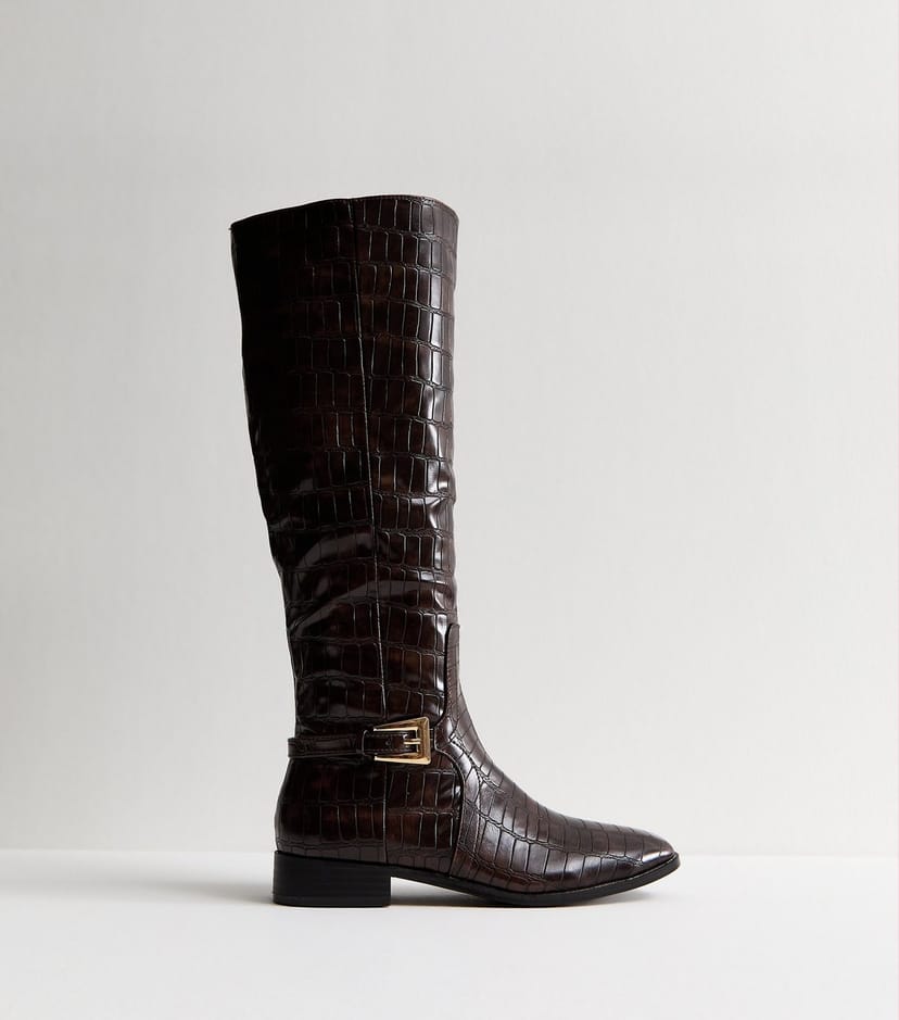 Elegant dark brown crocodile-embossed faux-leather knee-high boots. Perfect for adding a touch of textural glamour to your outfit. Crafted with a crocodile effect for a luxurious look.