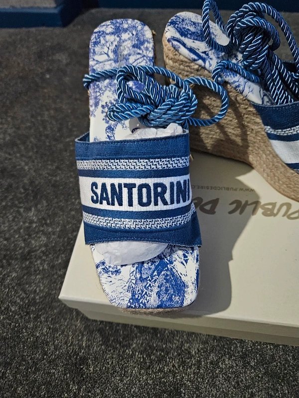 The Public Desire Santorini Navy Embroidered Lace Up Wedge Heels is available in sizes XXXL, XXL, XL, XS, L, M, S.