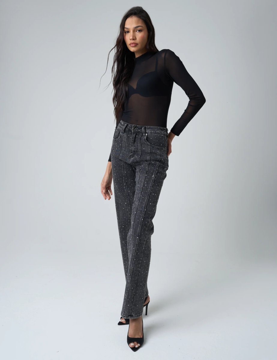 Step up your denim game with these dazzling embellished jeans! Featuring a flattering high waist and straight leg cut, these black jeans will elevate any outfit. The intricate embellishments add a touch of glamour to the classic style, making these a versatile and stylish addition to your wardrobe.