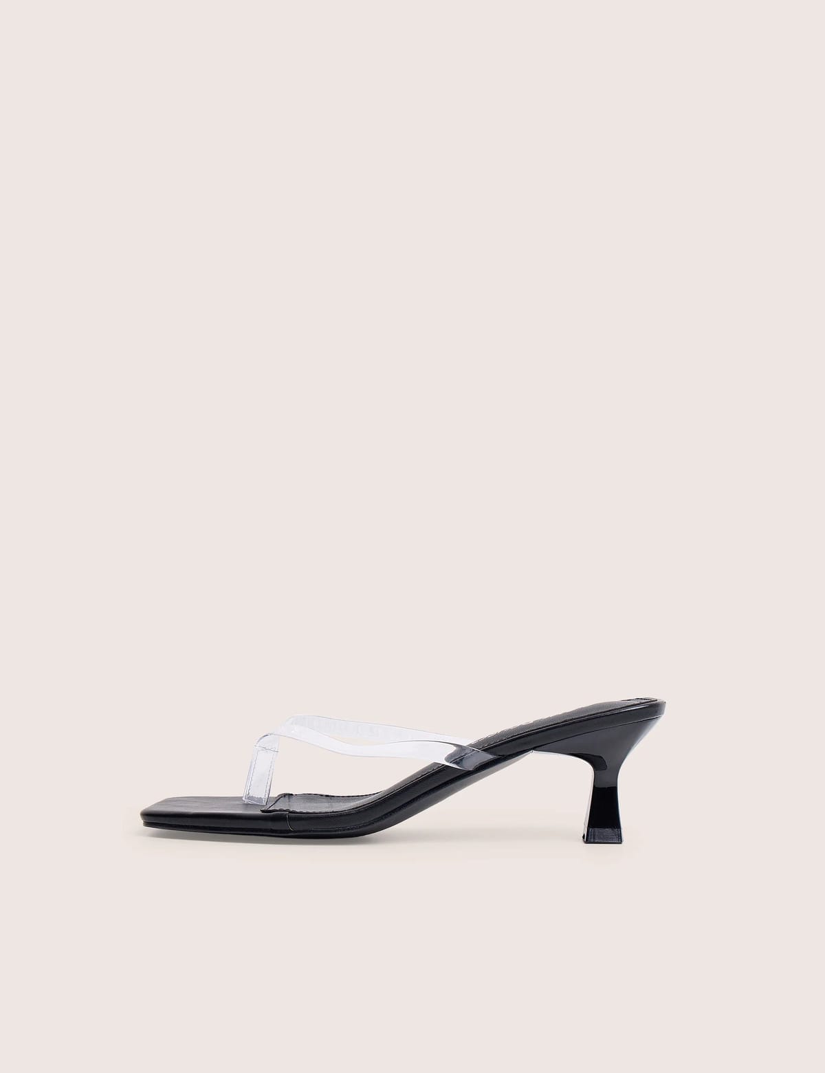 The Public Desire UK Black Perspex Thong Flip Flop Heels is available in sizes 3, 4, 5, 6, 7, 8.