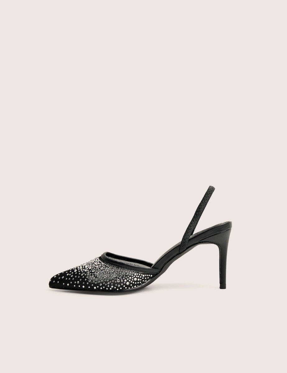 Elevate your style with these black mesh Embellished Sling Back Court Heels. The sleek design adds a touch of elegance, while the embellishments add a pop of glamour. Perfect for a night out.