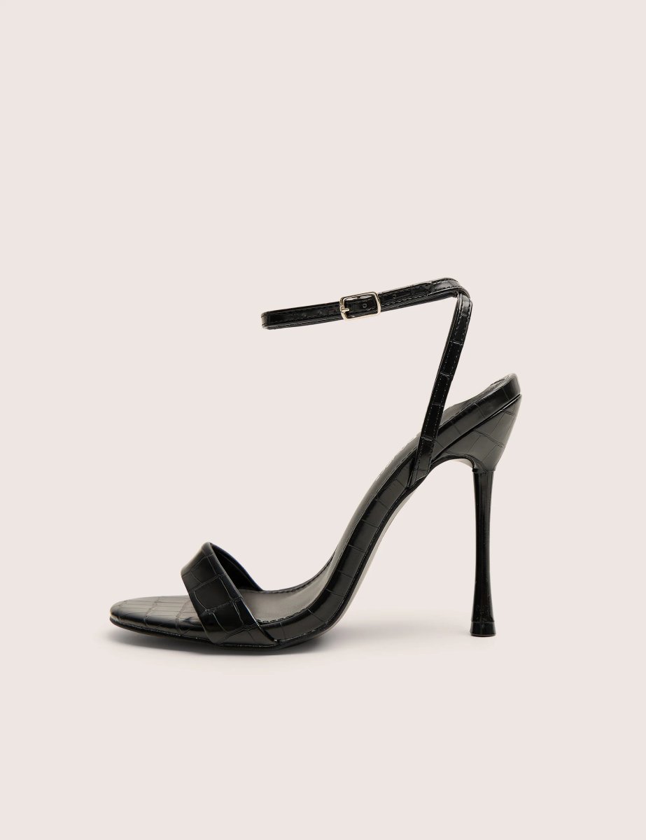Experience understated glamour with our barely there strappy stiletto heels in classic black. The crocodile texture creates visual intrigue while maintaining elegant simplicity. The slender stiletto heel elongates your silhouette beautifully. Perfect for evening events or nights out.