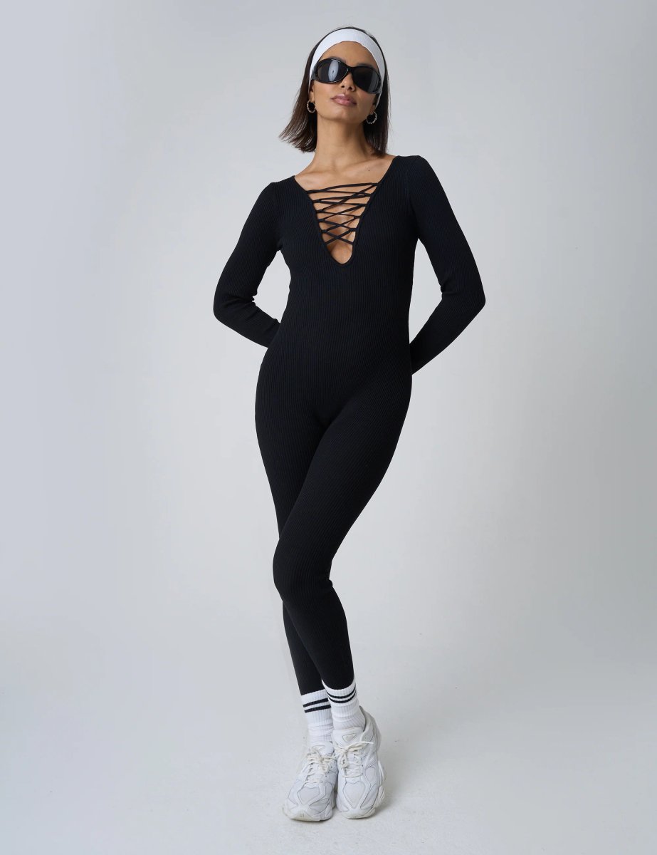 The Public Desire UK Tie Front Ribbed Long Sleeve Unitard in Black is ideal for workout, night out.