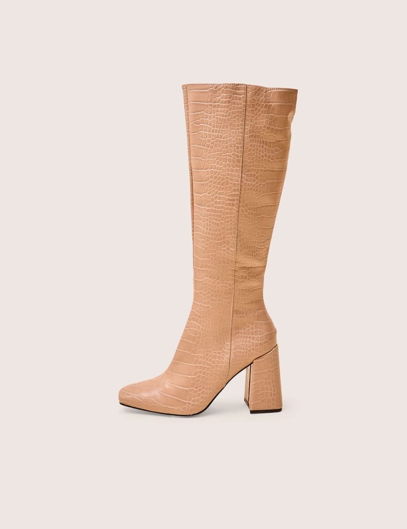The Public Desire UK Nude Croc Knee High Block Heel Boots is available in sizes 3, 4, 5, 6, 7, 8, 9.