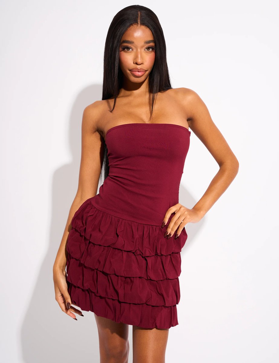 The Public Desire Bandeau Balloon Mini Dress in Burgundy is available in sizes 10, 12, 14, 6, 8.