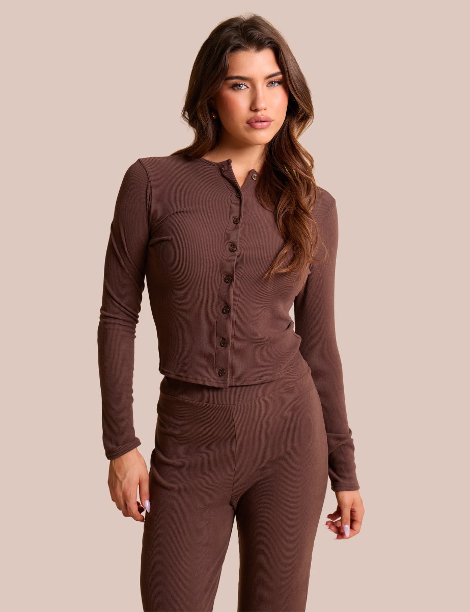 Elevate your wardrobe with the Chocolate Rib Button Through Long Sleeve Top by Public Desire. Crafted from a soft ribbed fabric, this versatile top features a flattering button-through front and long sleeves for added comfort. Its warm chocolate hue effortlessly complements any outfit, making it perfect for both casual days and chic layering.