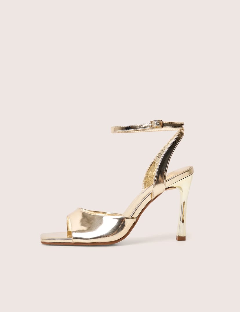 The Public Desire UK Gold Ankle Strap Peep Toe Heels is available in sizes 3, 4, 5, 6, 7, 8.