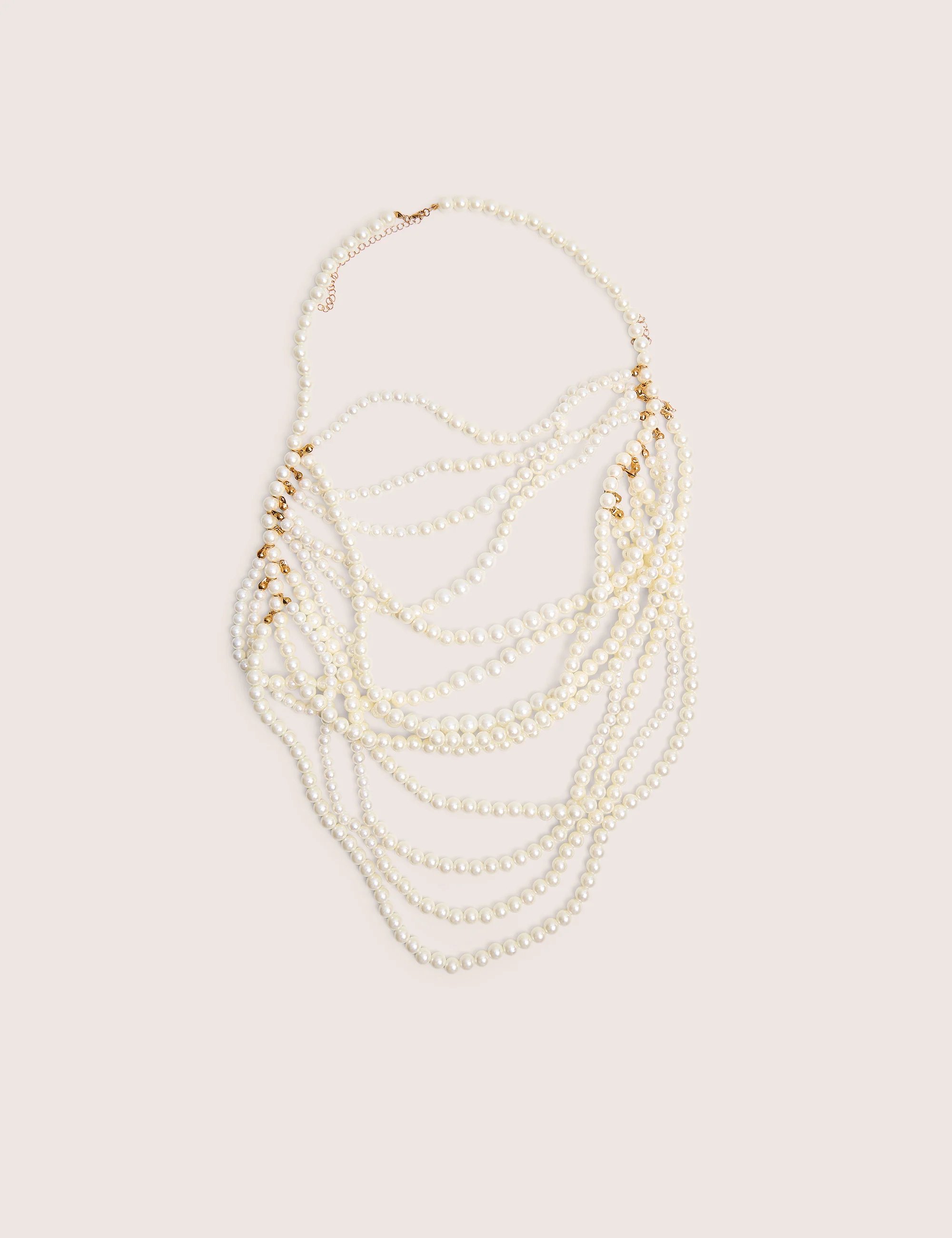 Elevate your jewellery collection with this stunning layered pearl necklace and body chain in classic white. Featuring delicate pearl accents cascading across multiple strands, this piece combines timeless elegance with contemporary styling. The versatile design transitions seamlessly from day to evening wear.