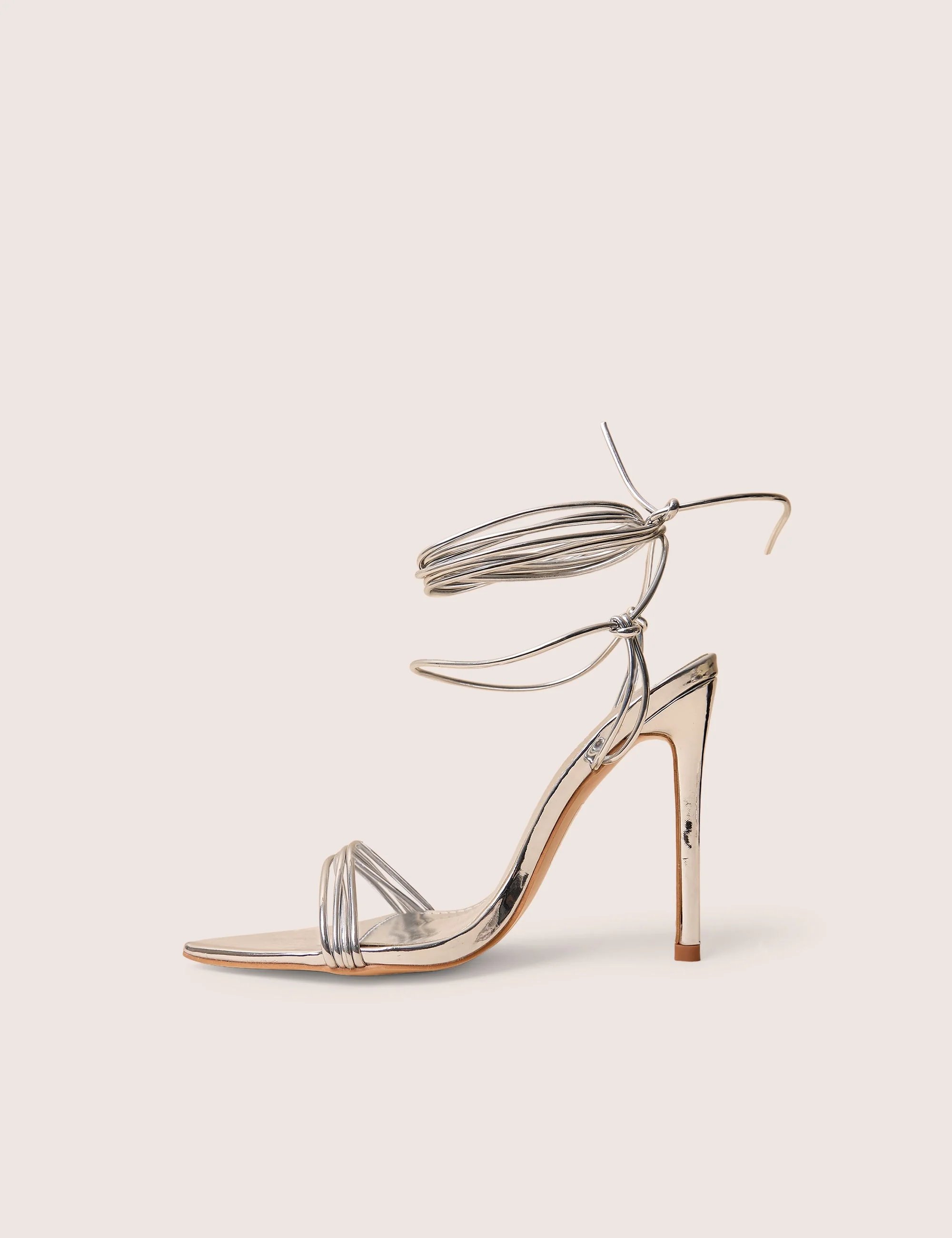 The Public Desire UK Merlot Mirror Silver PU Lace Up Wrap Around Pointed Toe Stiletto Heels is ideal for evening, party, formal.