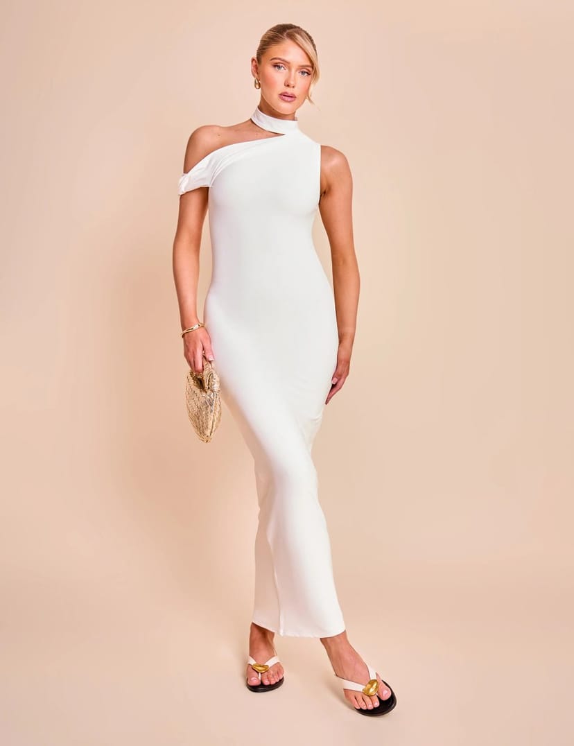 The Public Desire UK Asymmetrical One Shoulder Midi Dress in White is ideal for evening, formal, party.