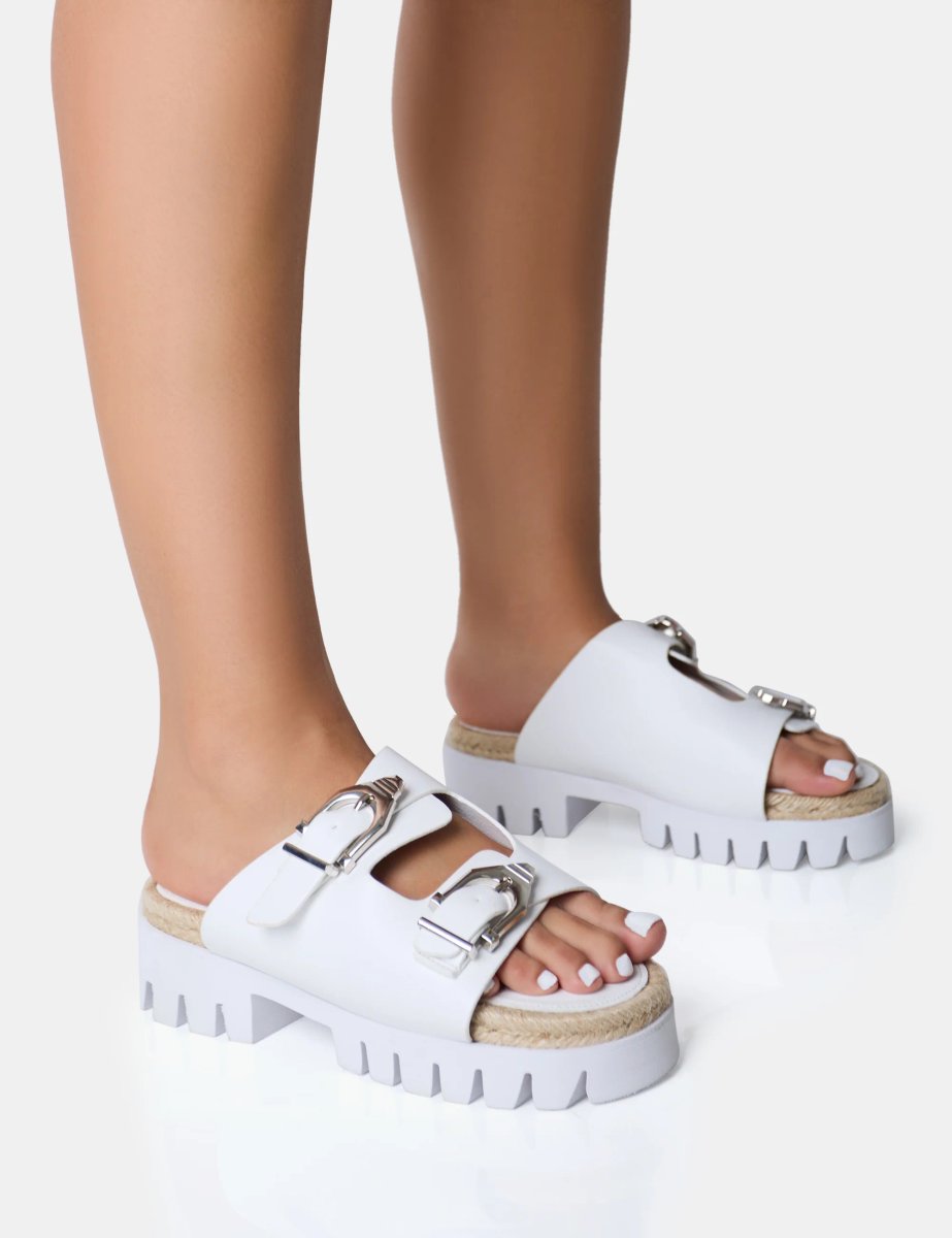 The Public Desire White Chunky Jute Detail Buckle Flatform Sandals is available in sizes 3, 4, 5, 6, 7, 8.