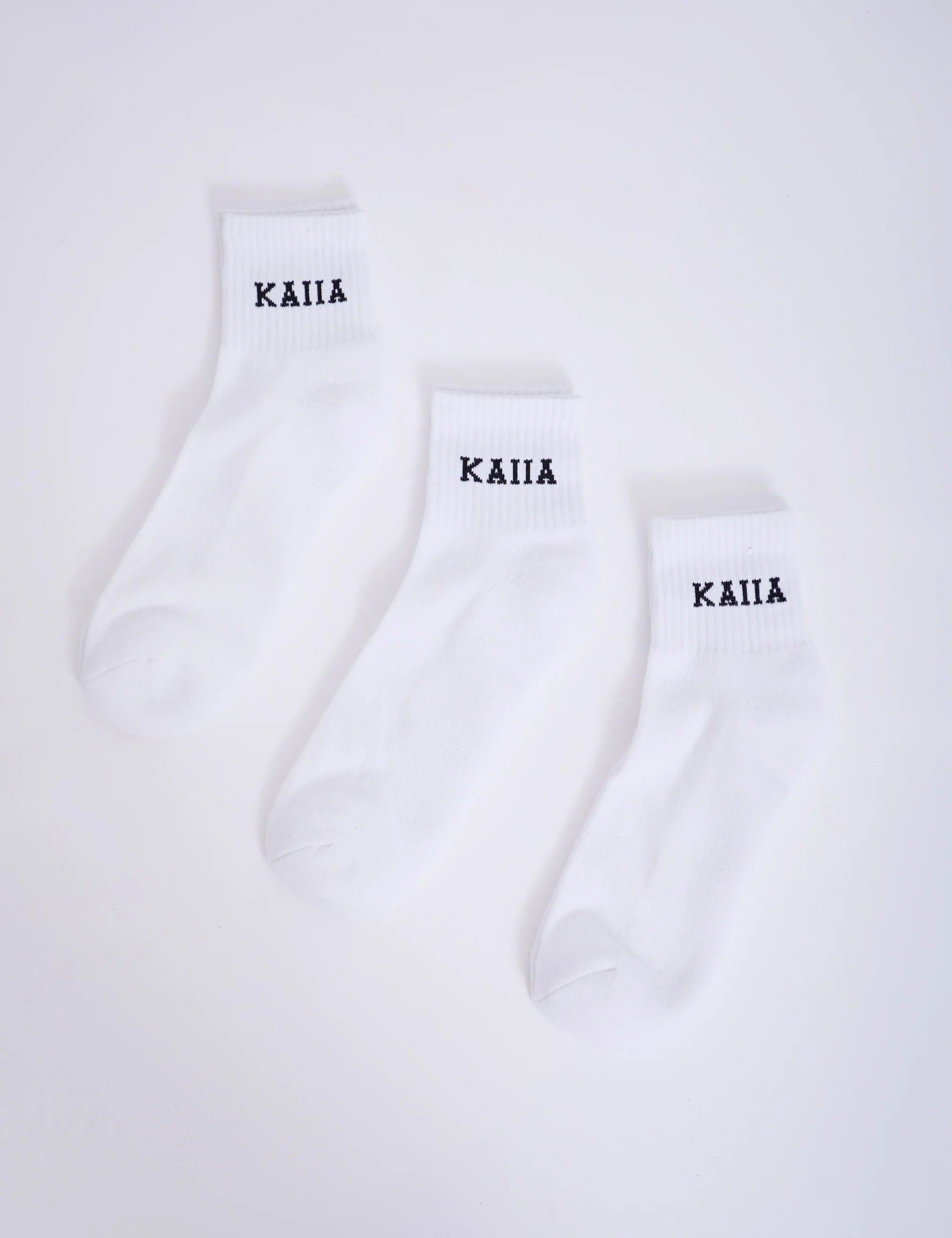 Add some sporty style and comfort to your sock collection with our Kaiia Logo Socks! Crafted with a soft and durable material, these socks feature a stylish white and black logo design, perfect for any active lifestyle. Get ready to run errands, hit the field or go to the gym in style! Pack of 3 pairs.