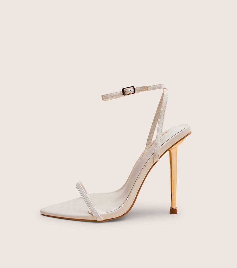 The Public Desire White Faux Leather Stiletto Heel Sandals is available in sizes 3, 4, 5, 6, 7, 8, 9.