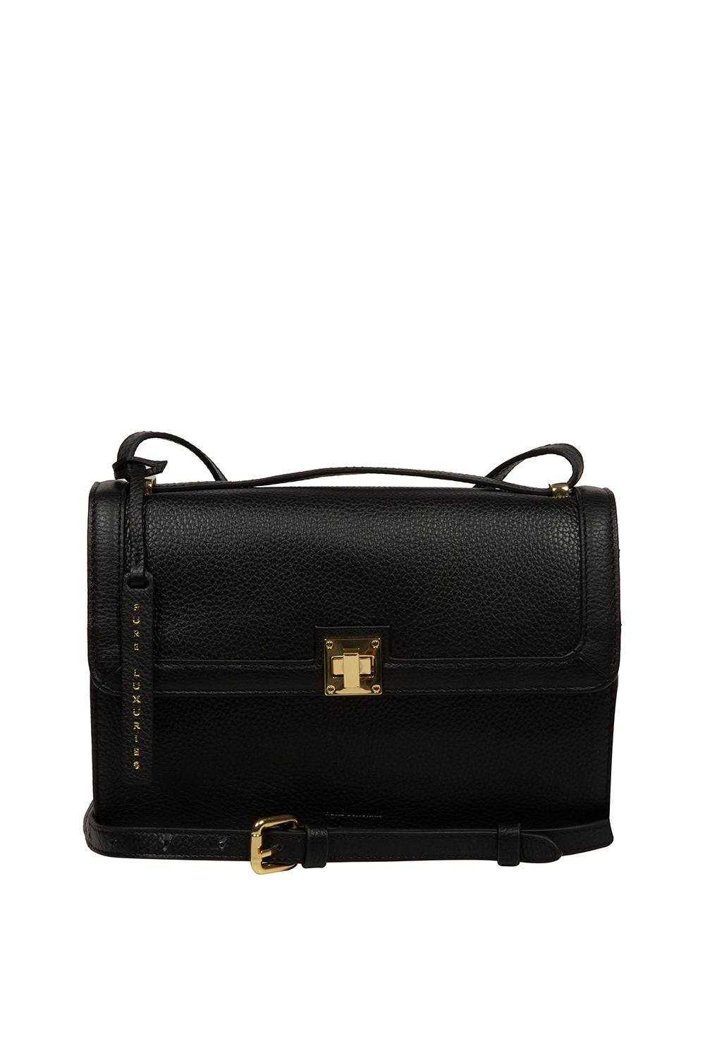 Elegant black leather cross body bag with a pebble grain finish. Features a sleek twist lock fastener and a unique trio of compartments. Perfect for everyday use.