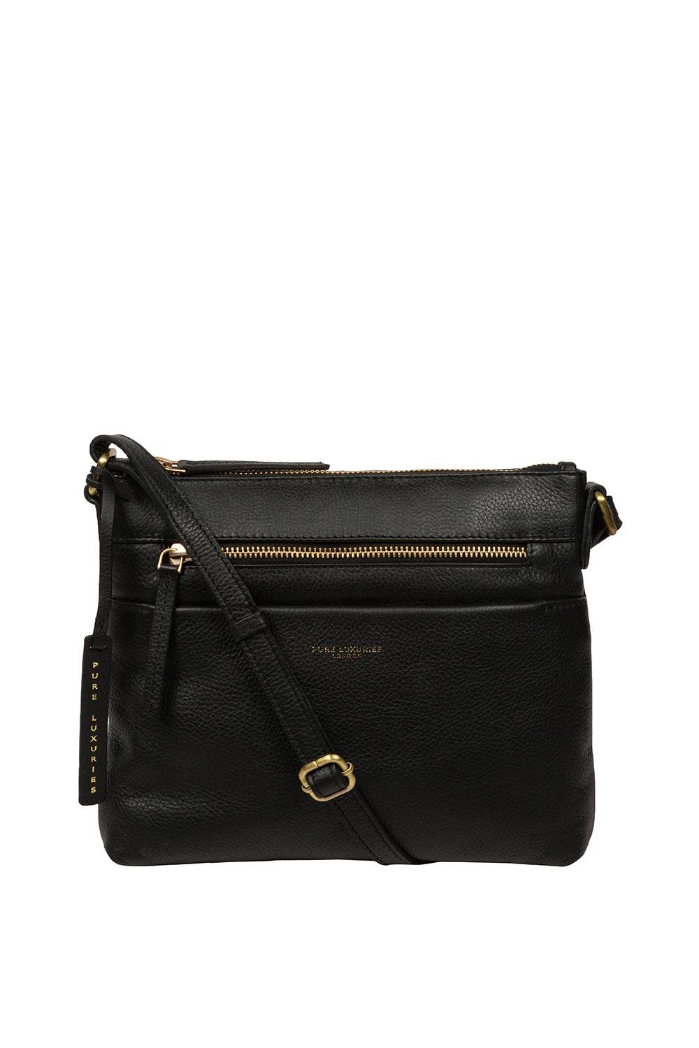 Sophisticated black leather cross body bag from Pure Luxuries London. Features a gold foil logo embossed on the front and a hanging charm. The bag has a zip-over top securing the main compartment.