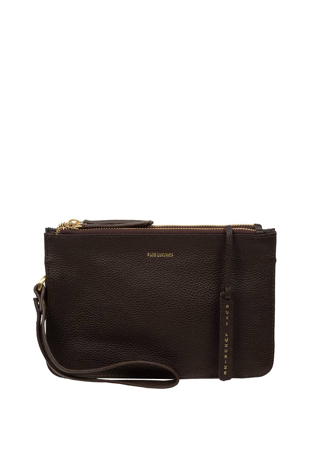 Stylish Dark Brown leather clutch bag from Pure Luxuries London. Features a pebble grain finish and a dual zip-over top for secure closure. The interior boasts a soft yet robust lining. Perfect for evening events or special occasions.