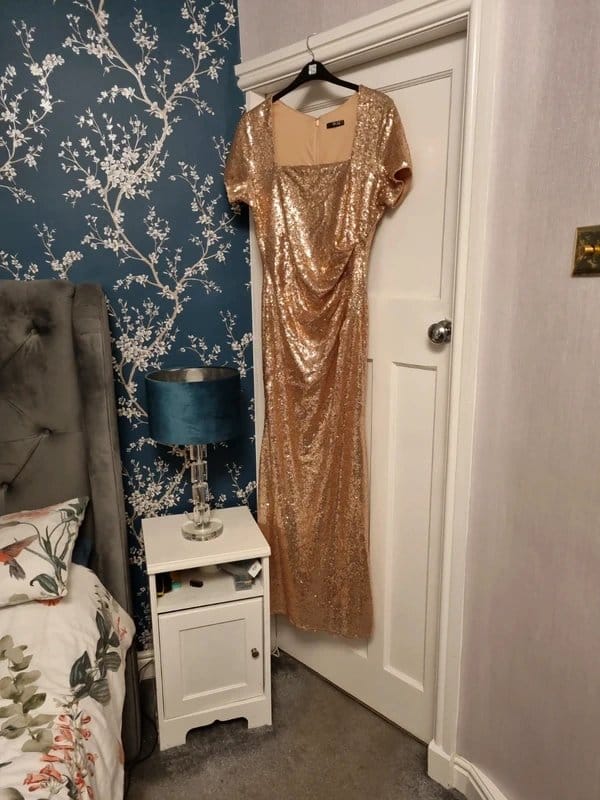 A stunning rose gold sequin evening dress from Quiz. This full-length dress features flattering ruched stitching on the left hip area. Fully lined with a hook and eye closure and a zip-up back, it's perfect for special occasions like Christmas, cruises, and cocktail parties.
