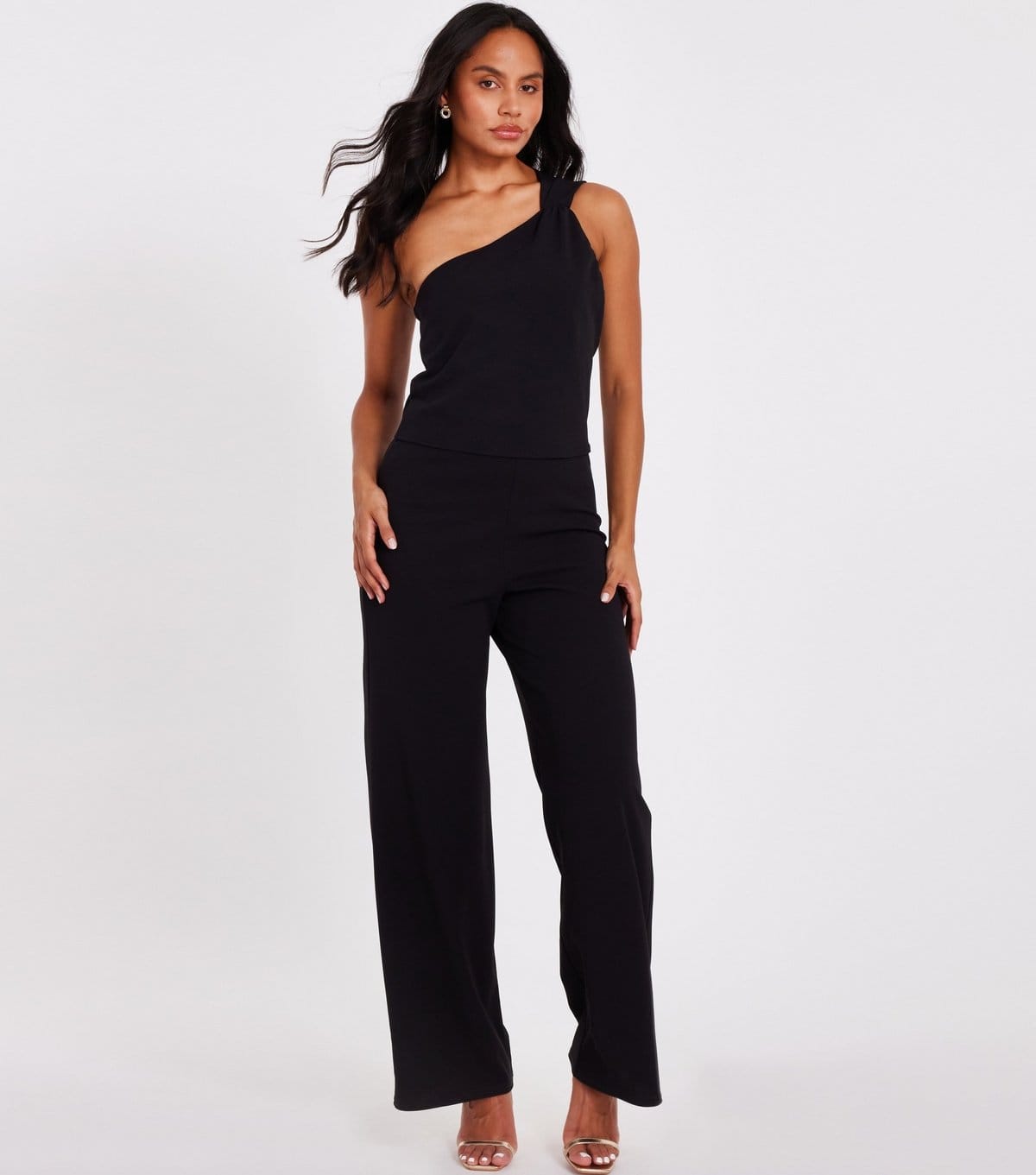 Stylish black woven one-shoulder jumpsuit by Quiz. Features a slim fit and wide-leg pants. Perfect for evening events or a date night.