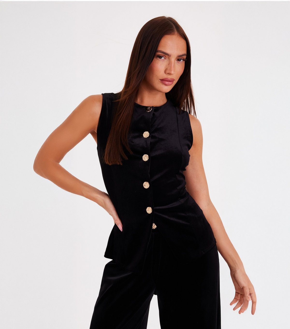 Luxurious black velvet waistcoat from QUIZ featuring a fitted silhouette and gold-tone hammered buttons. Ideal for a chic after-five look.