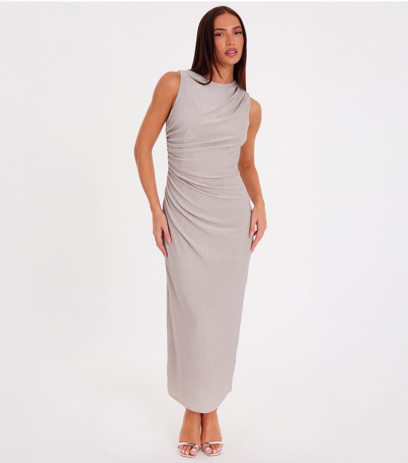 This shimmering glitter dress from QUIZ has a draped silhouette that's perfect for glam nights out. Pair the sparkly champagne dress with heels to complete the luxe look.