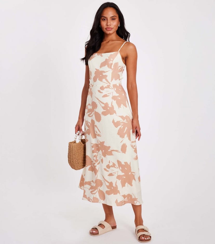See all outfit ideasCharming midi dress in cream and pink floral print featuring a square neckline and adjustable slim straps. The tie bow back adds a playful touch. Ideal for casual outings or garden parties.