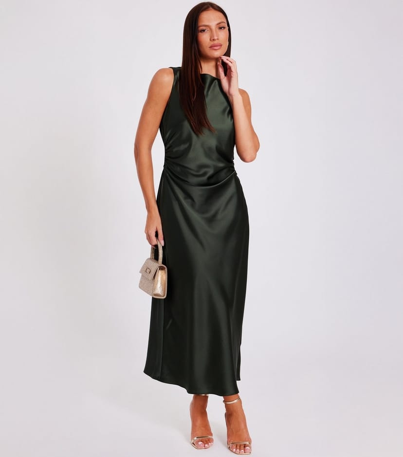The Quiz Olive Satin Sleeveless Midaxi Dress is ideal for evening, date-night, party.