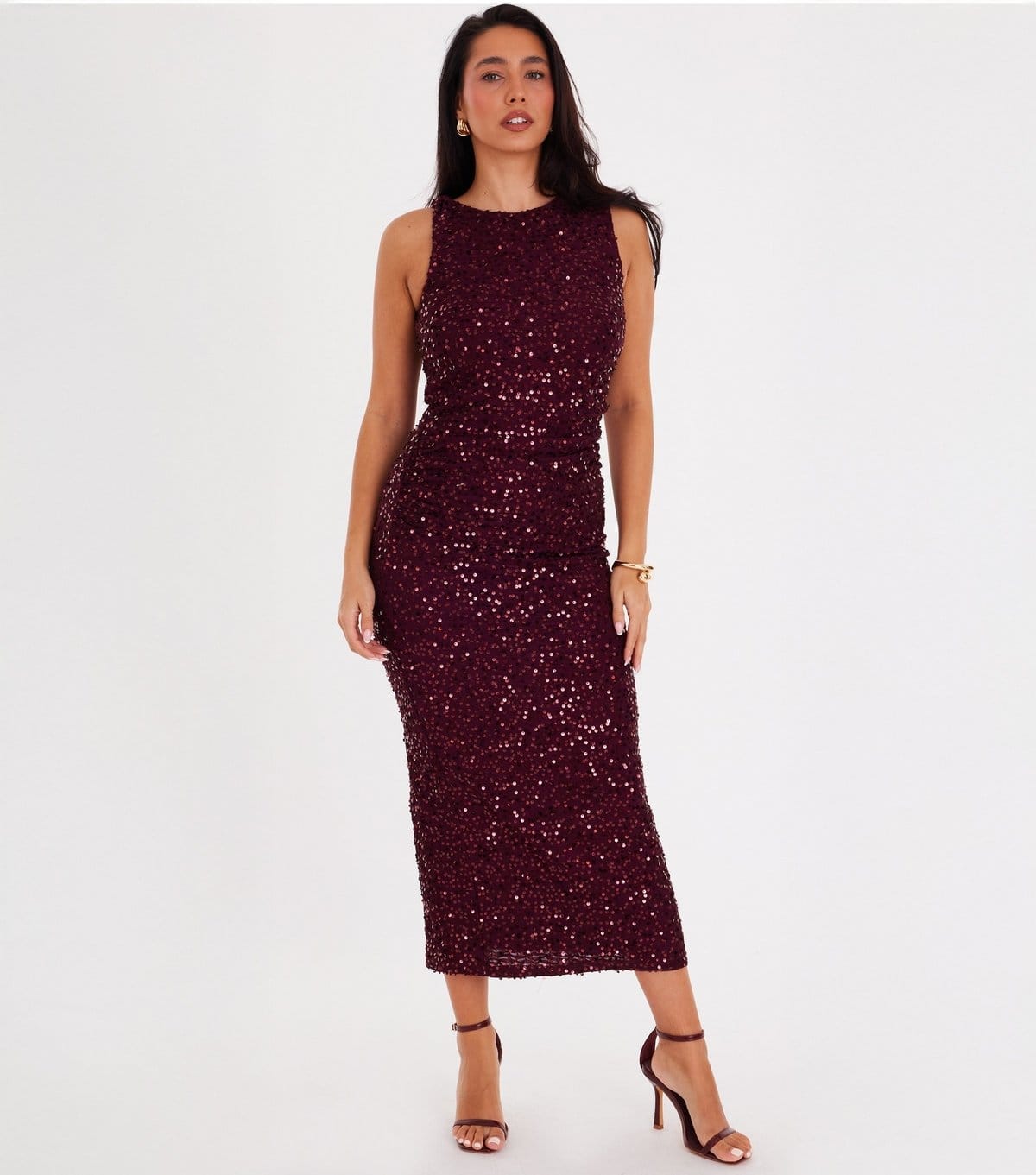 The Quiz Dark Red Sequin Ruched Midi Dress is made from sequin, polyester.
