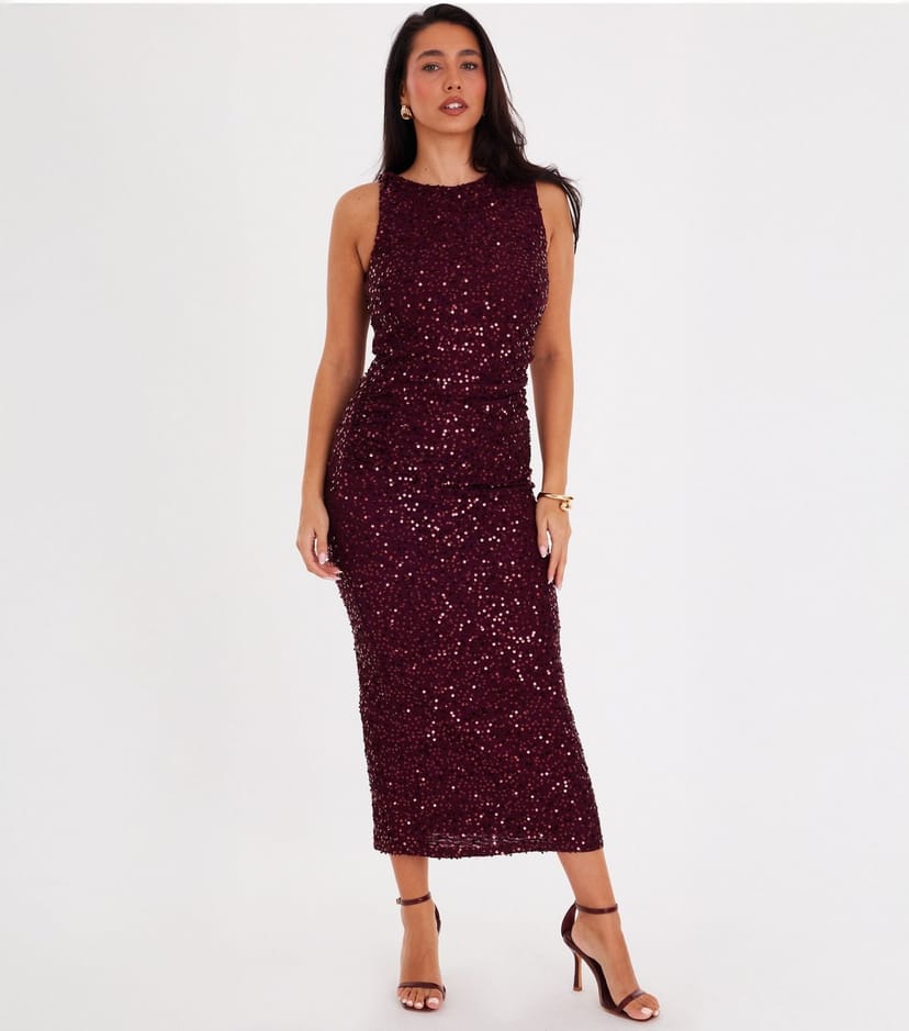 The Quiz Dark Red Sequin Ruched Midi Dress is ideal for party, evening, date-night.