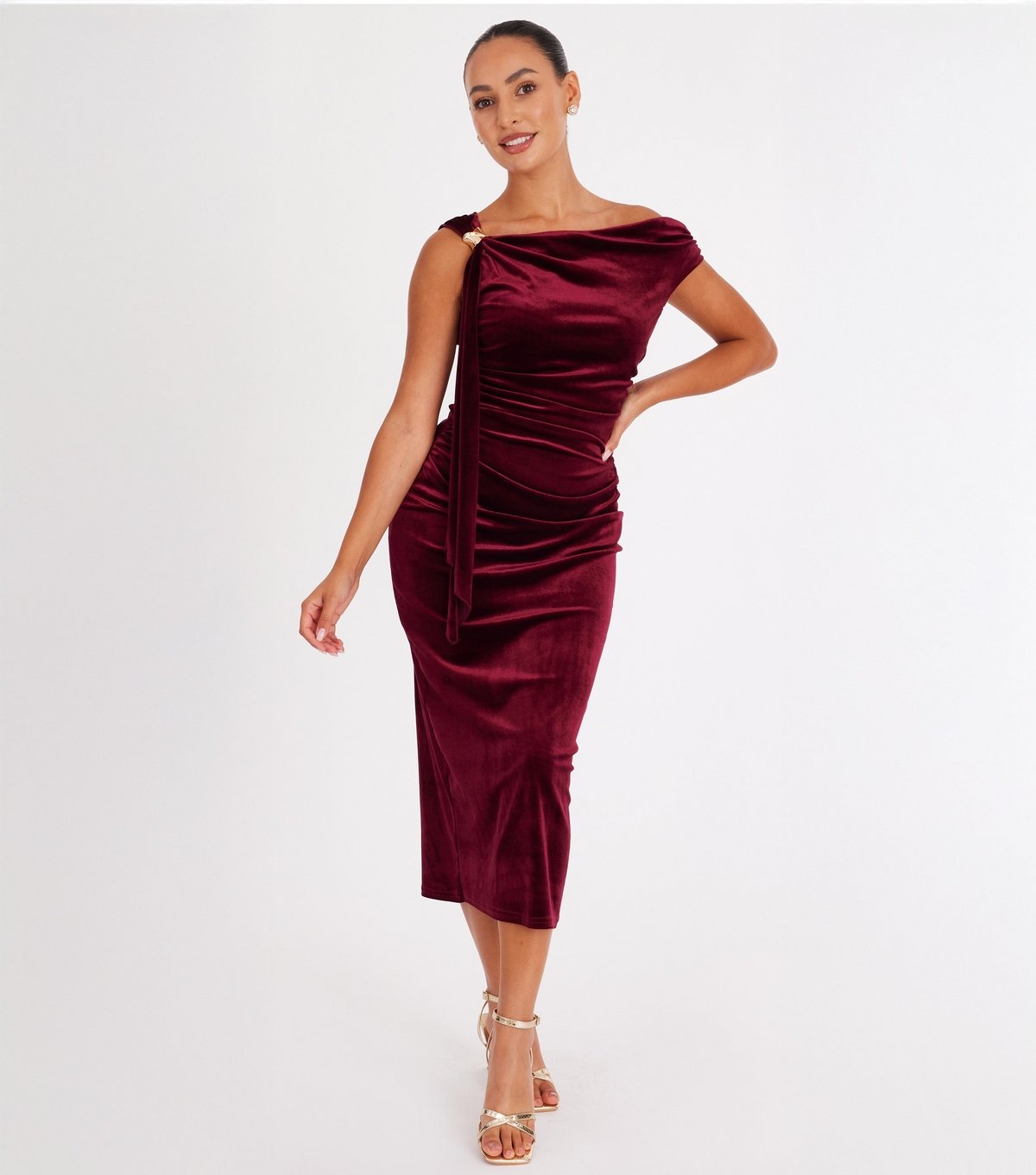 This dark red velvet midi dress from QUIZ Petite offers an elegant silhouette with its sleek figure-skimming design. The asymmetric neckline and ruching provide a lasting interest, making it perfect for evening events.