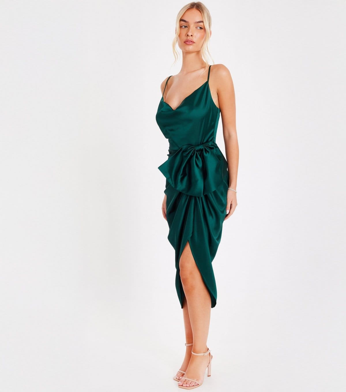 The Quiz Emerald Satin Cowl Neck Midi Dress is made from satin.
